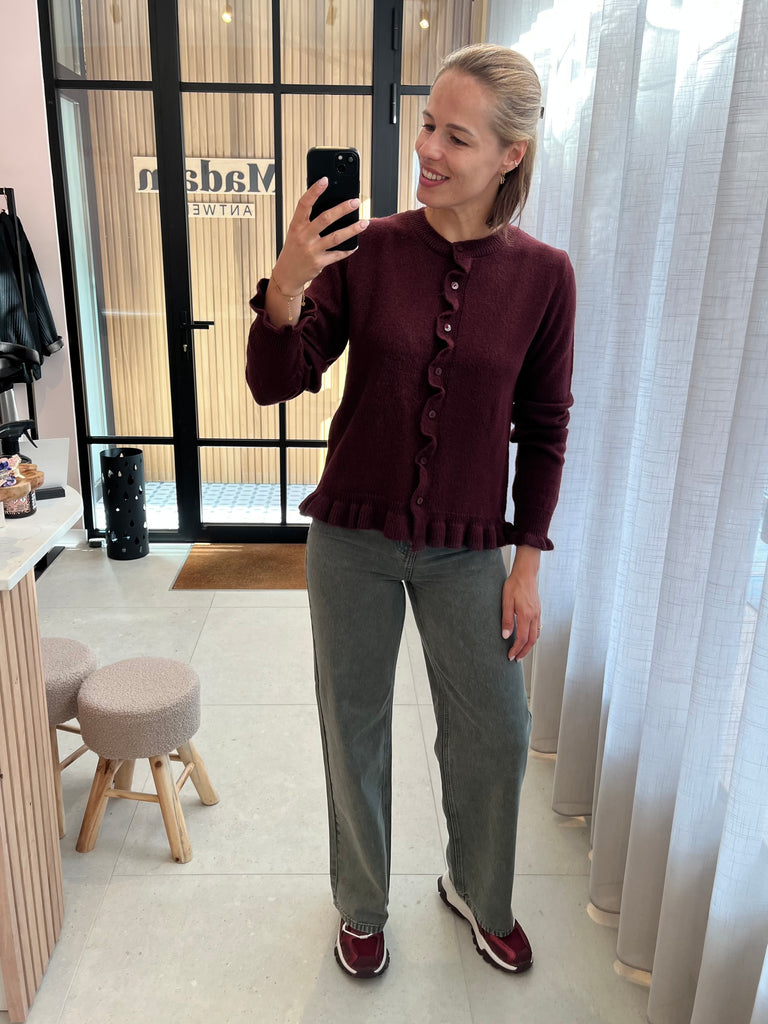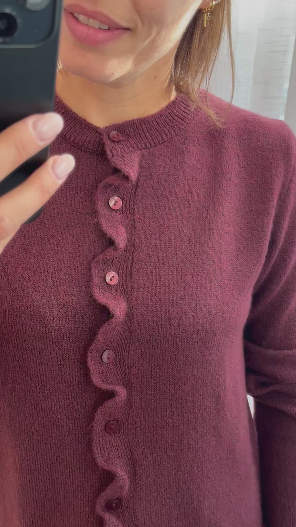 Super zachte cardigan met ronde hals, lange mouwen en speels randje aan de sluiting en de polsen. Sluiting met knoopjes vooraan.