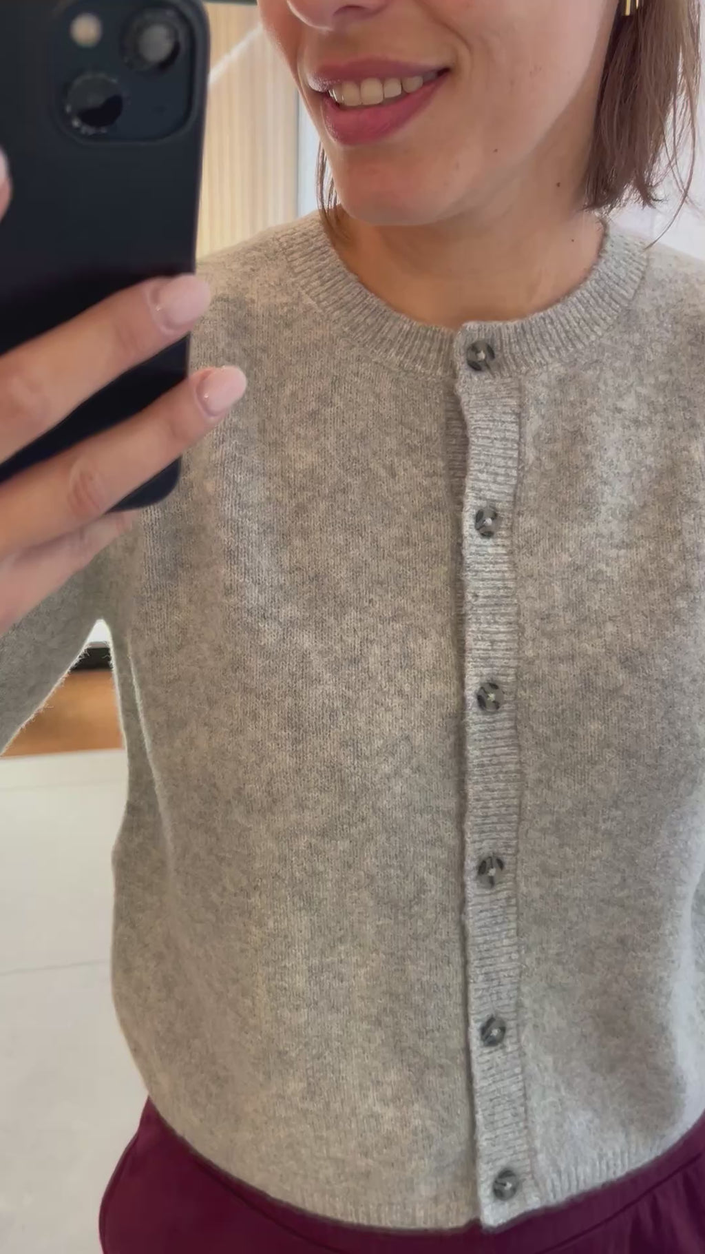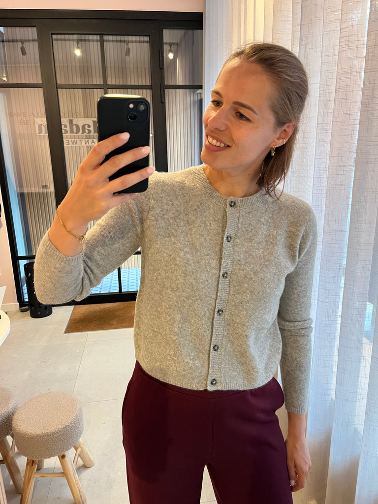 Zachte cardigan met ronde hals en lange mouwen. Sluiting met knoopjes vooraan. Iets korter model.
