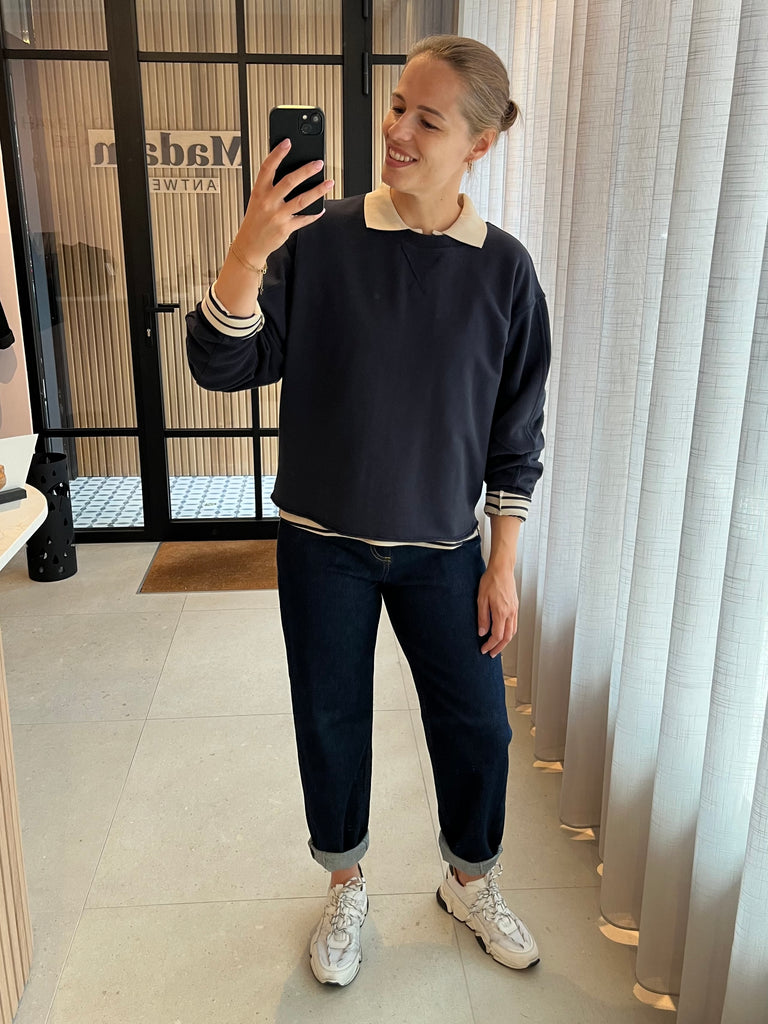 Losvallende sweater in lichte stof met lange mouwen, ronde hals en speels afgewerkte boord onderaan. Afgewerkt met ribstof op de onderkant van de mouwen en aan de polsen.