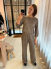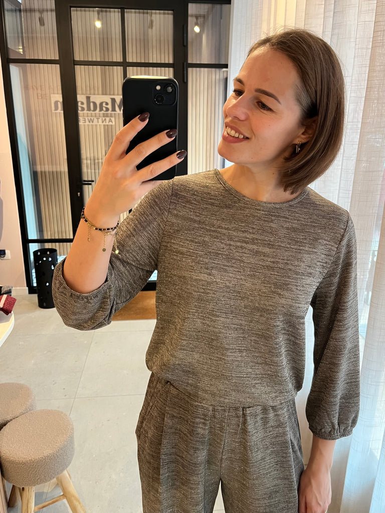 Losvallende top met 3/4e mouwen en elastische bandje onderaan de mouwen. Subtiele glitter in de stof. Super leuk als set met broek Danice ;-)