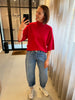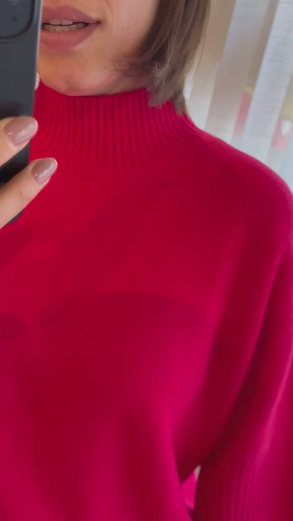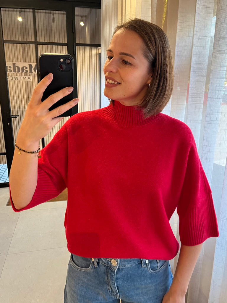 Losvallende trui met opstaande kraag en halflange mouwen met brede ribboord. Super zacht!