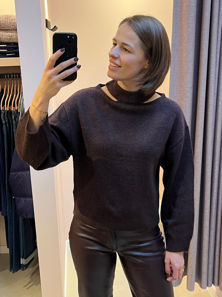 Comfy, losvallende trui met lange mouwen, opstaand kraagje en cut-outs op de schouder. Super zacht!
