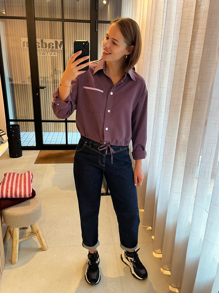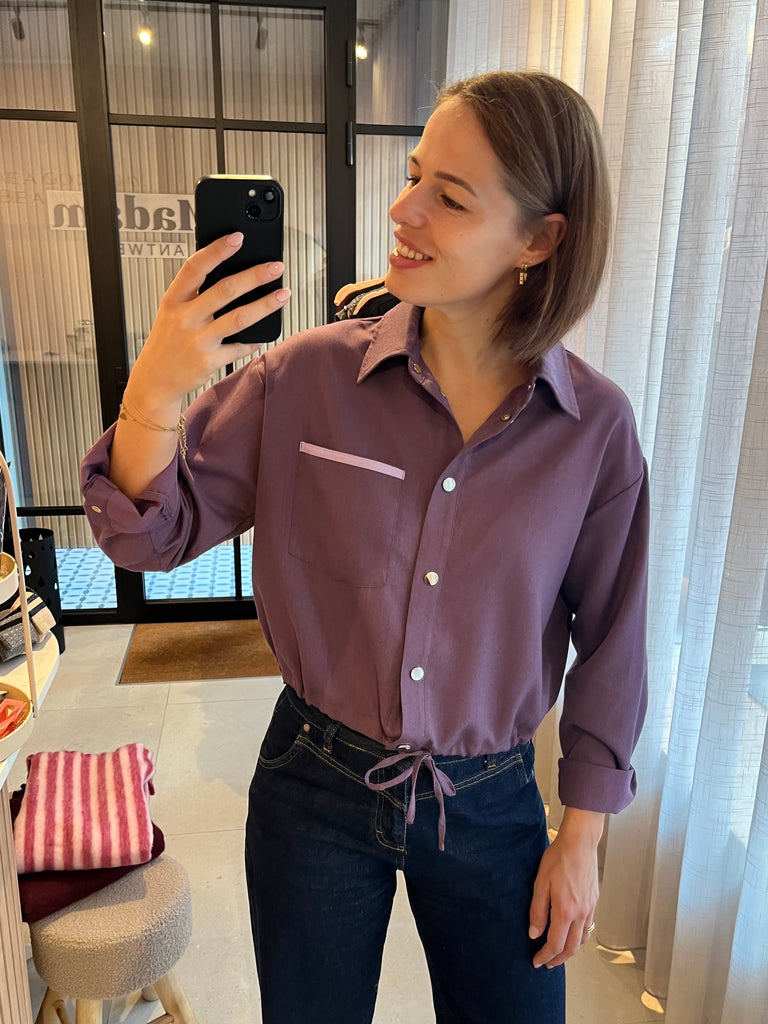 Sportieve, losvallende blouse in lichte stof met drukknoopjes en lintje dat je onderaan kan knopen om de taille te accentueren. Speels, contrasterend boordje op de borst. Super leuk als set met broek Zizi :-)