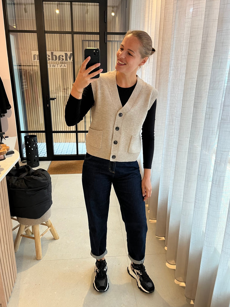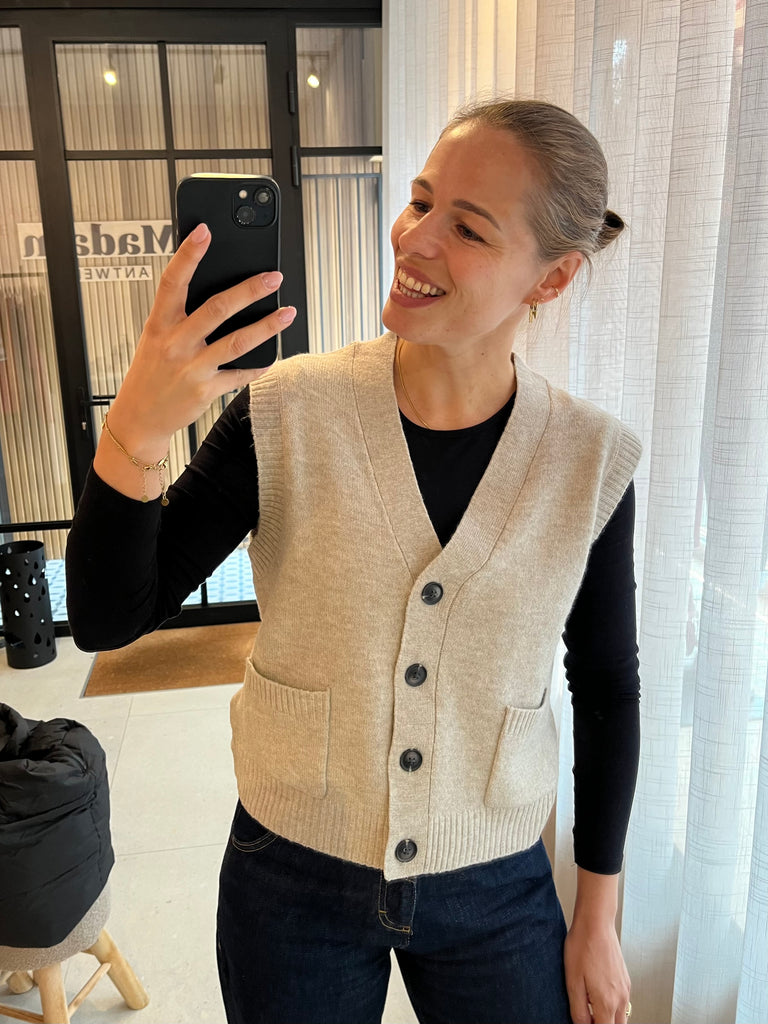 Mouwloze debardeur met subtiel afhangende schouders, v-hals en grote knopen vooraan. Super zacht!