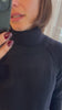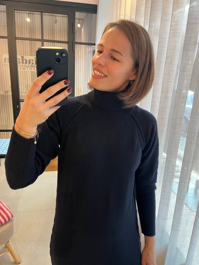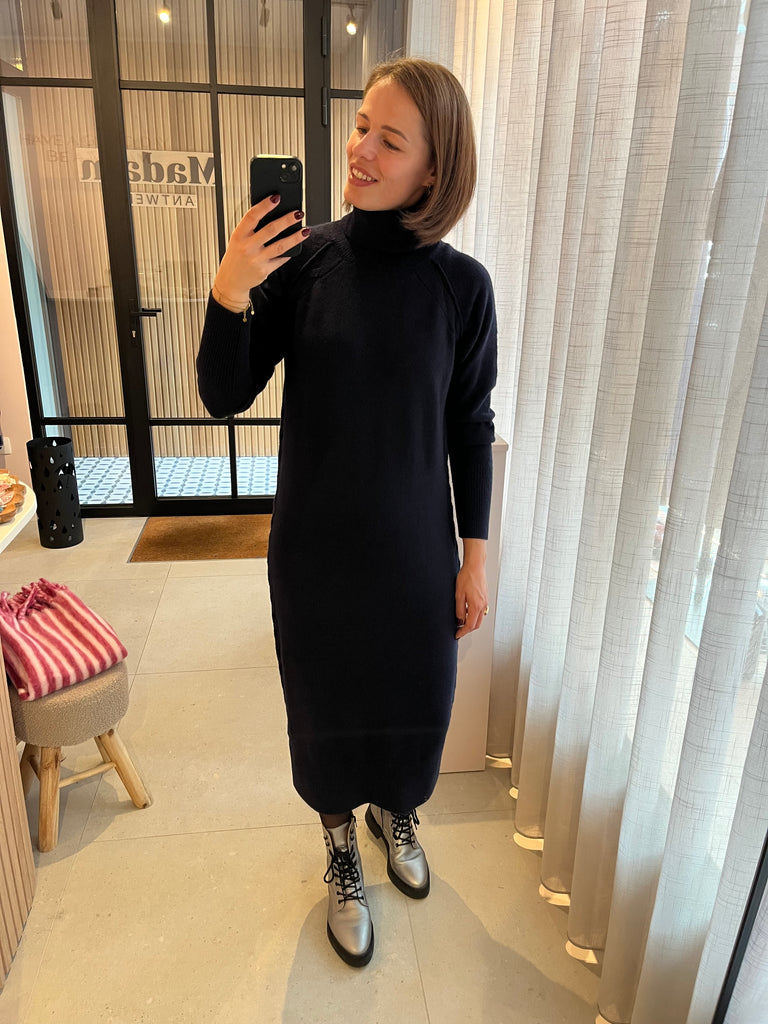 Lange, losvallende, gebreide jurk met lange mouwen en rolkraag. Prachtig patroon op de zijnaad.