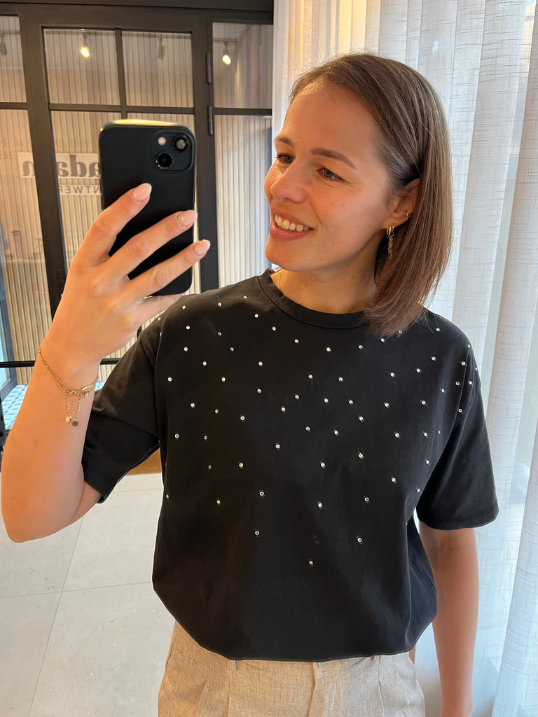 Losvallend t-shirt met korte mouwen, ronde hals en glittersteentjes op de stof.