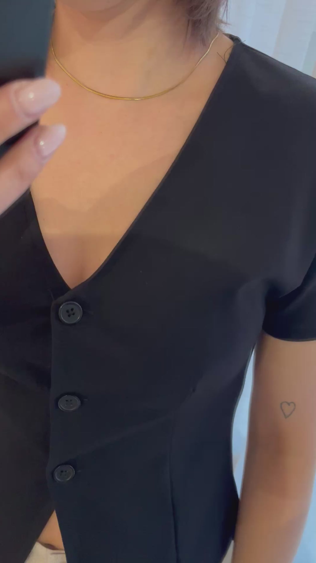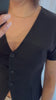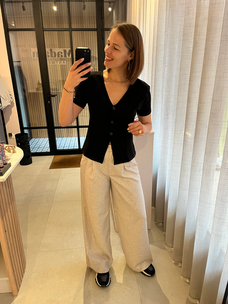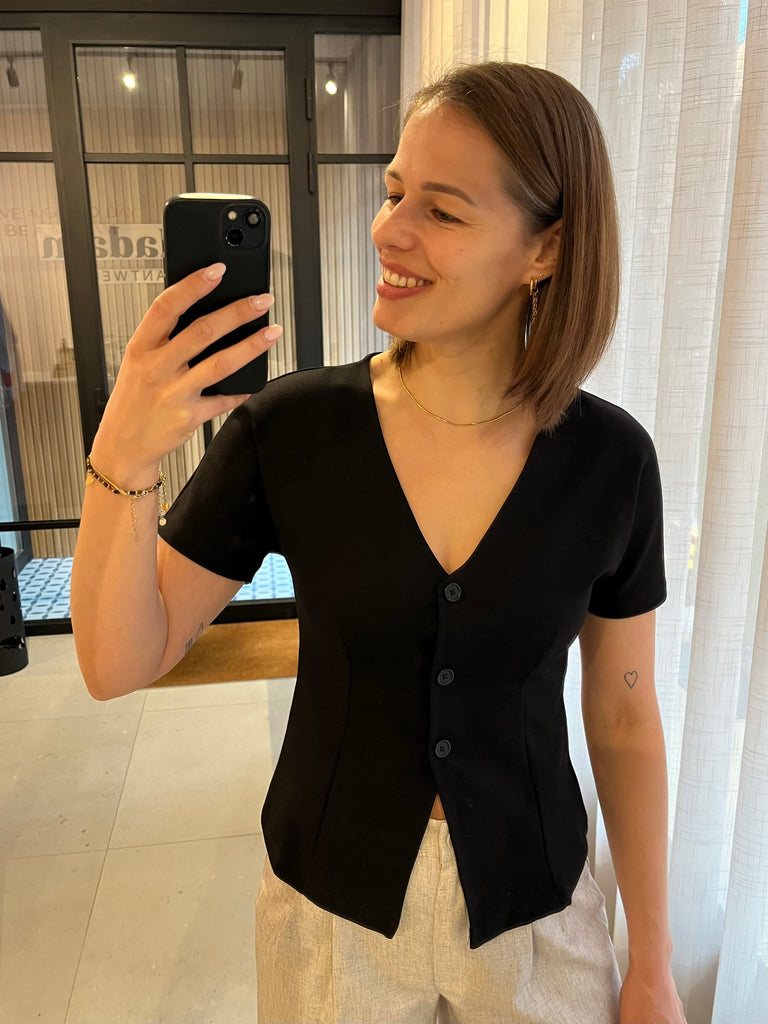 Gecentreerde, aansluitende top met korte mouwen, v-hals, knoopjes en splitje vooraan. Draag je zo of over een aansluitend t-shirt.