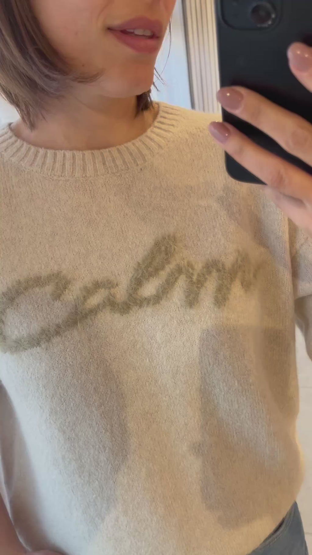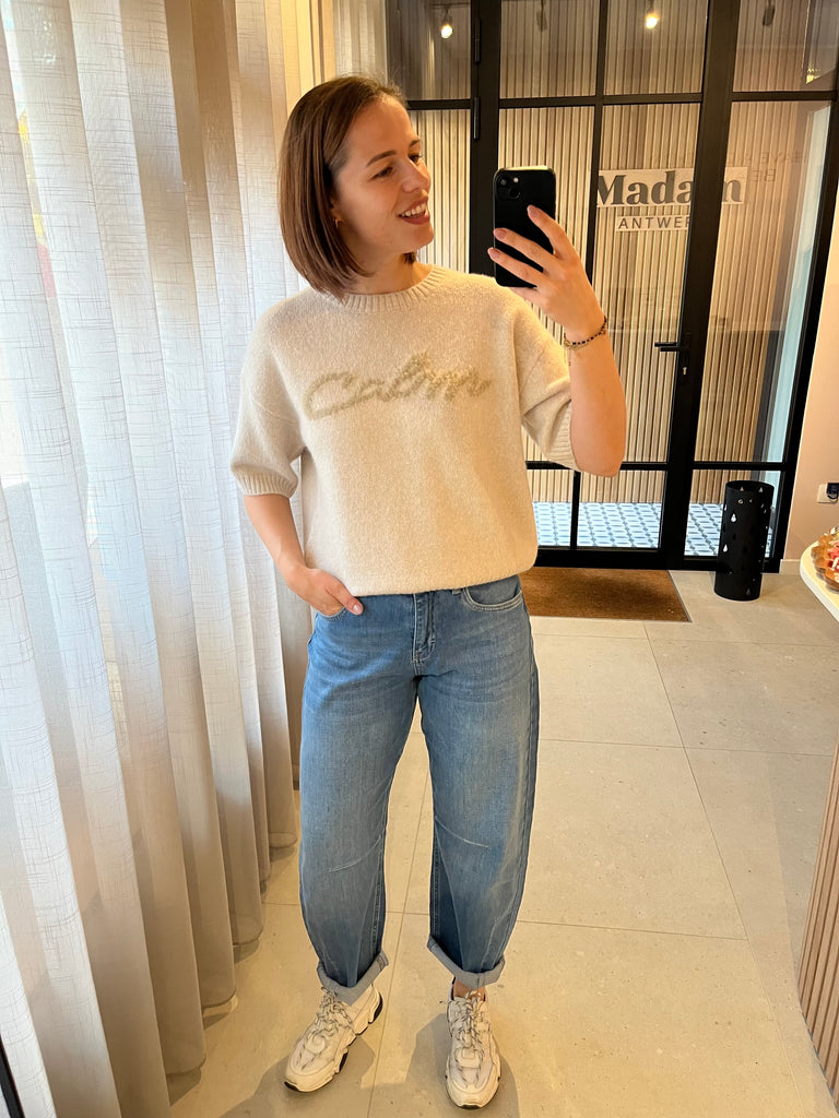Rechtvallende, gebreide trui met halflange mouwen en fluffy 'calm'-tekst vooraan.
