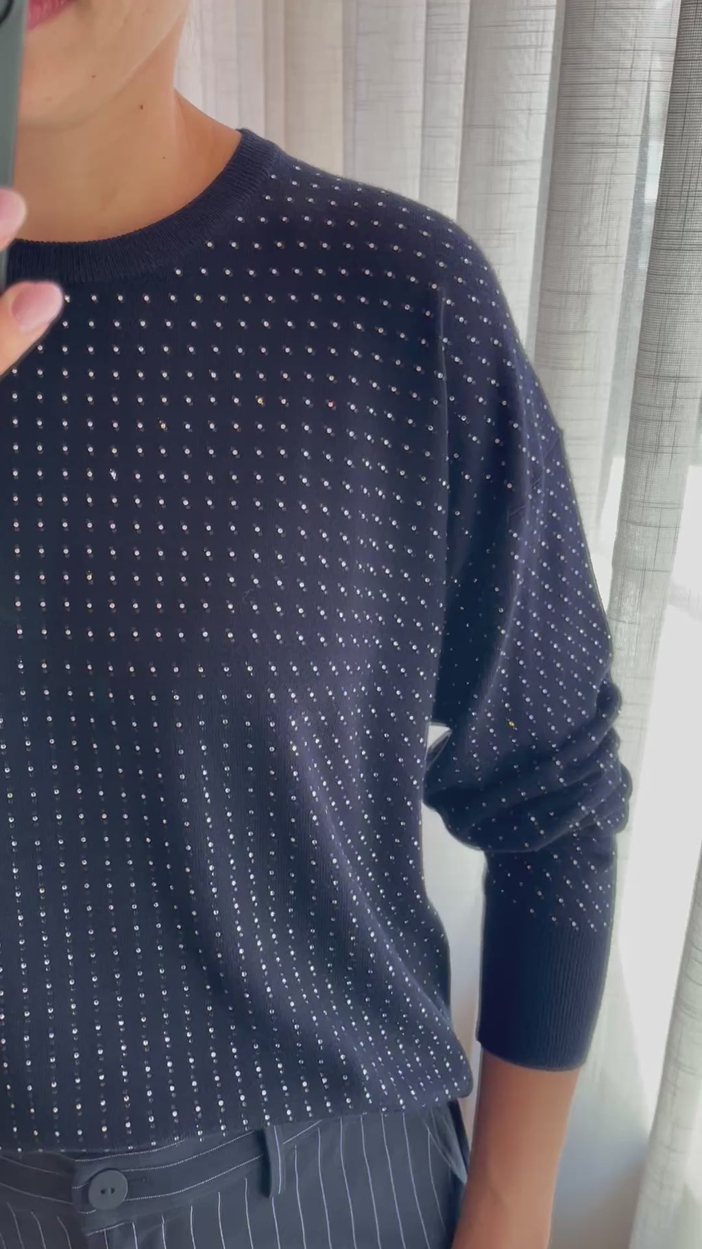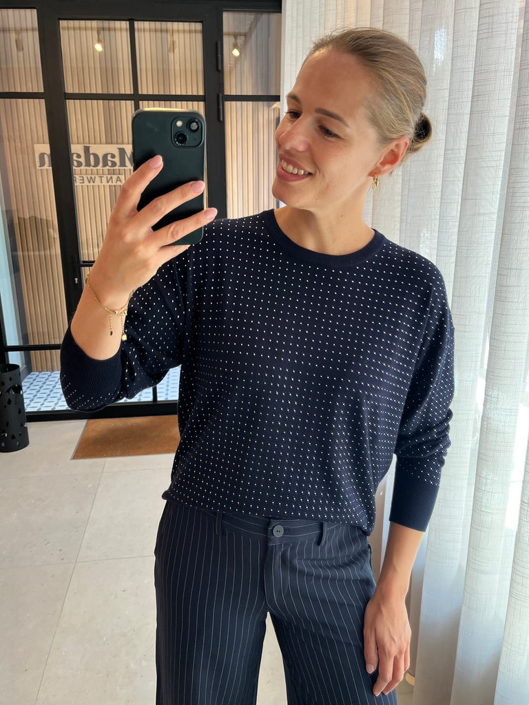 Super zacht trui'tje met ronde hals en lange mouwen. Afgewerkt met fijne glitters op de stof.