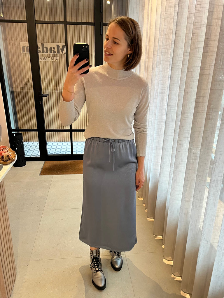 Subtiel glanzende rok in satijn-look met lichte structuur in de stof. Elastische tailleband met striksluiting.