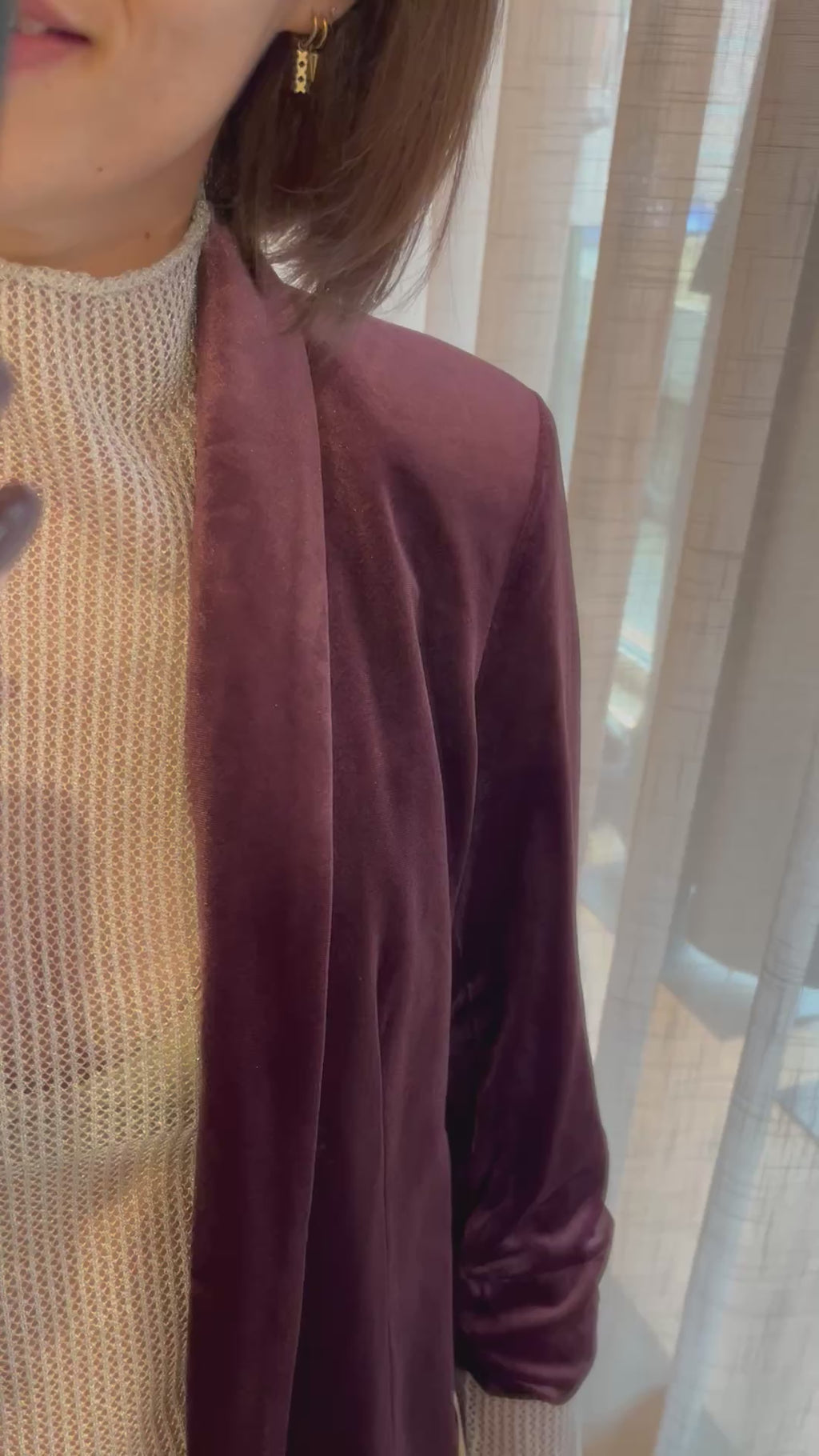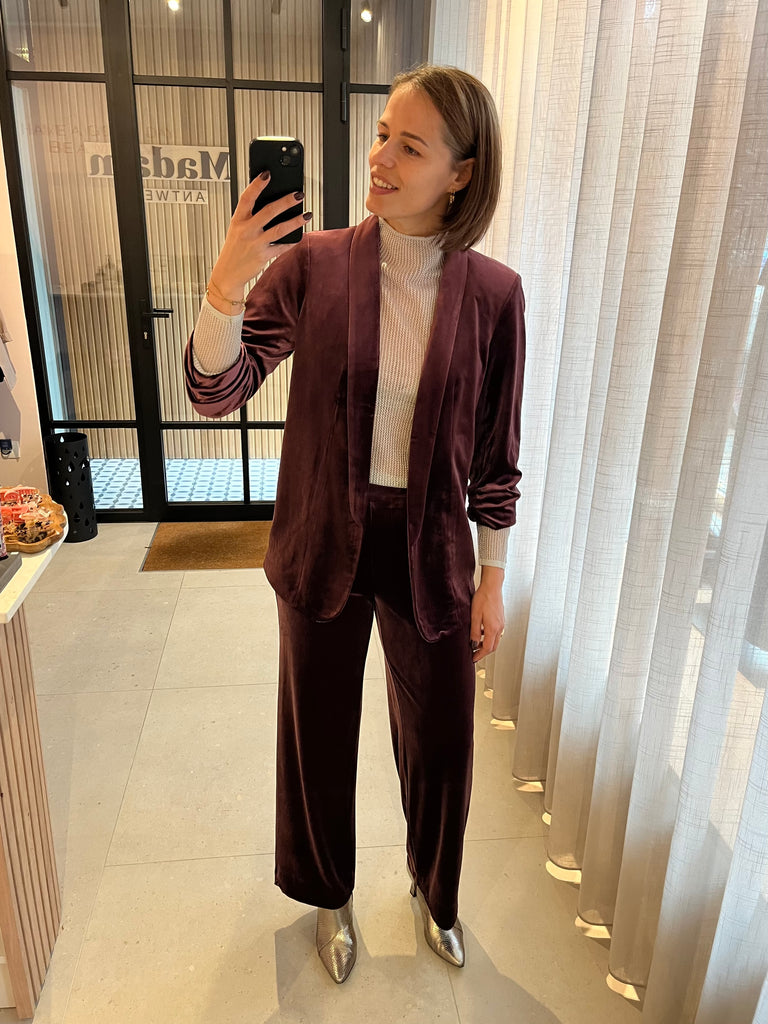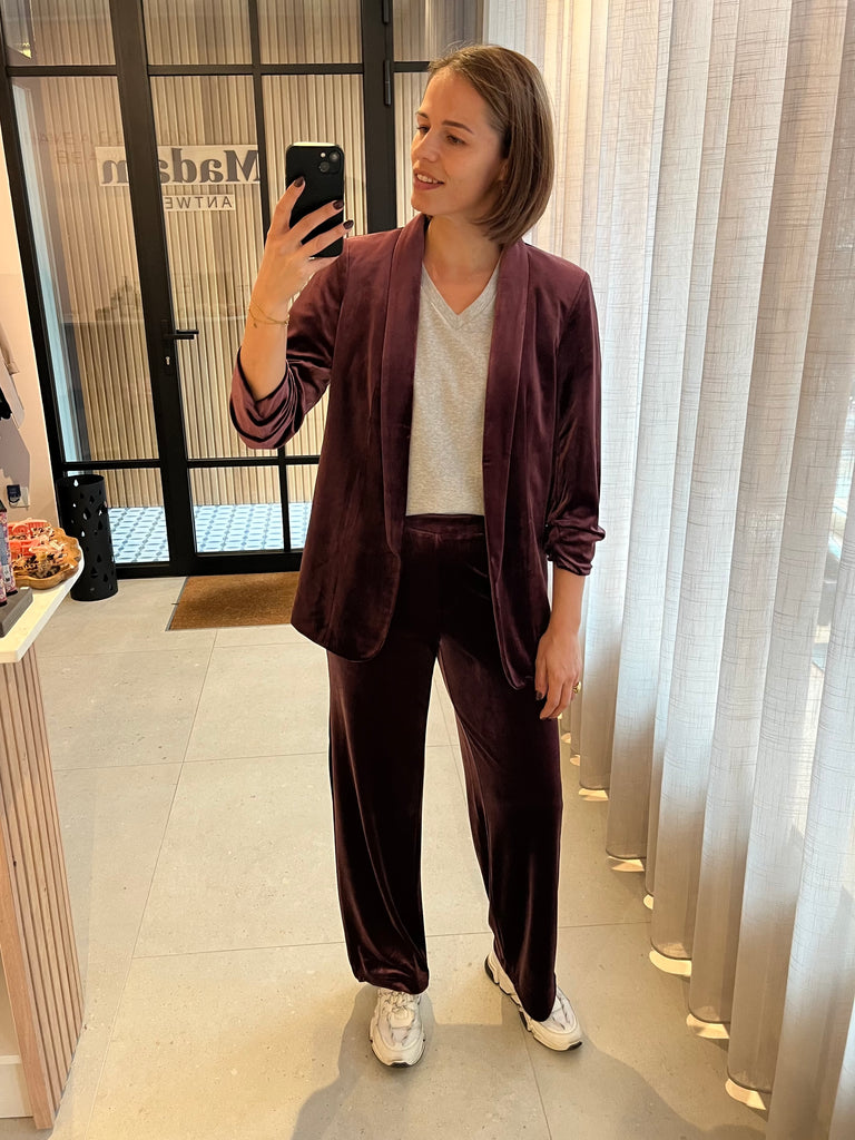 Gevoerde blazer met 3/4e opgestroopte mouwen en subtiele schoudervullingen. Super comfortabel, iets langer model in prachtig velours. Super leuk als set met broek Bosella :-)