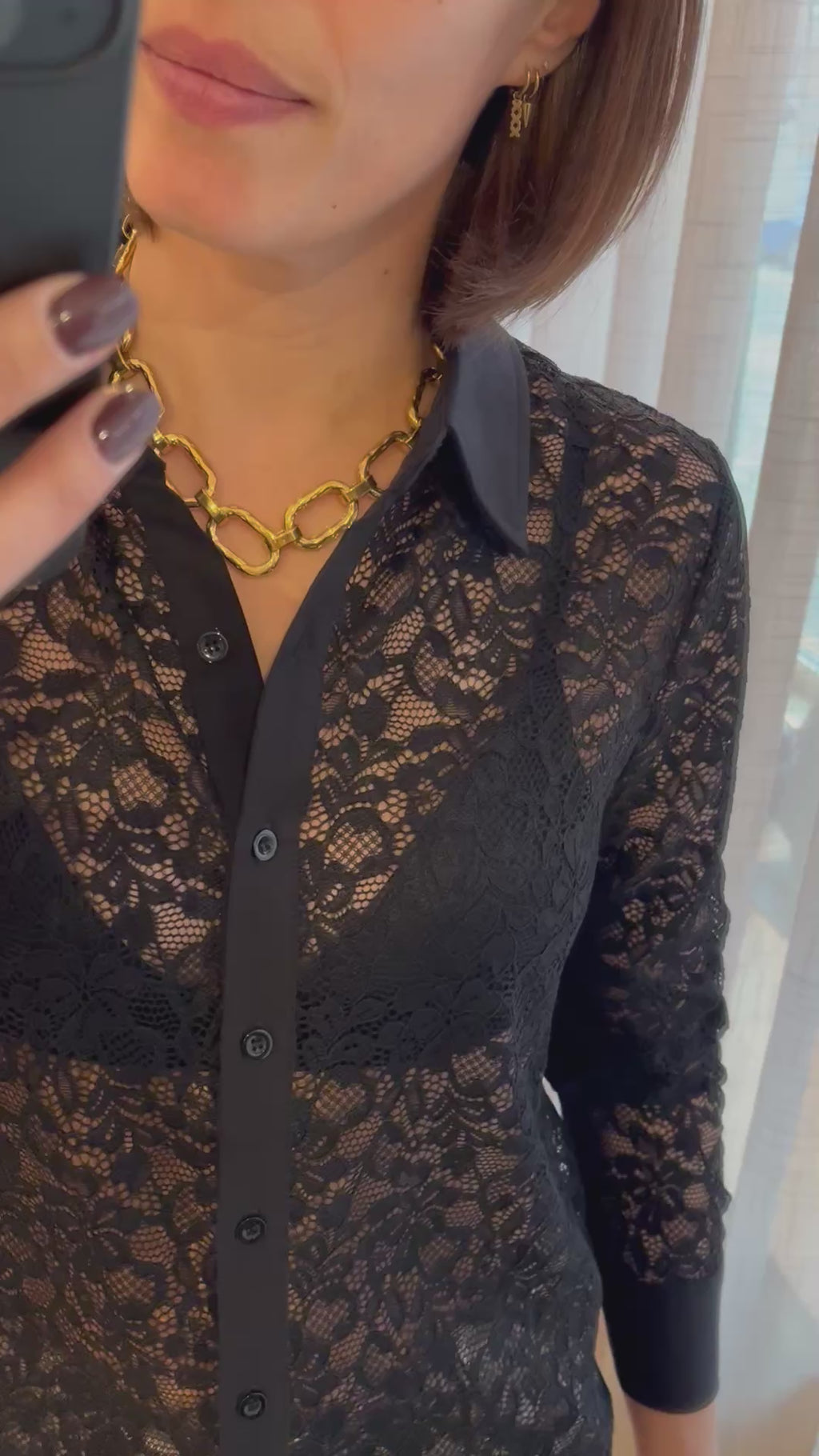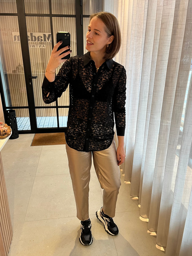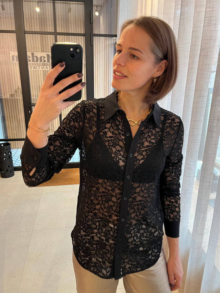 Losvallende blouse in prachtig kant. Afgewerkt met een kraagje en sluiting met knoopjes vooraan.