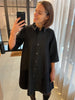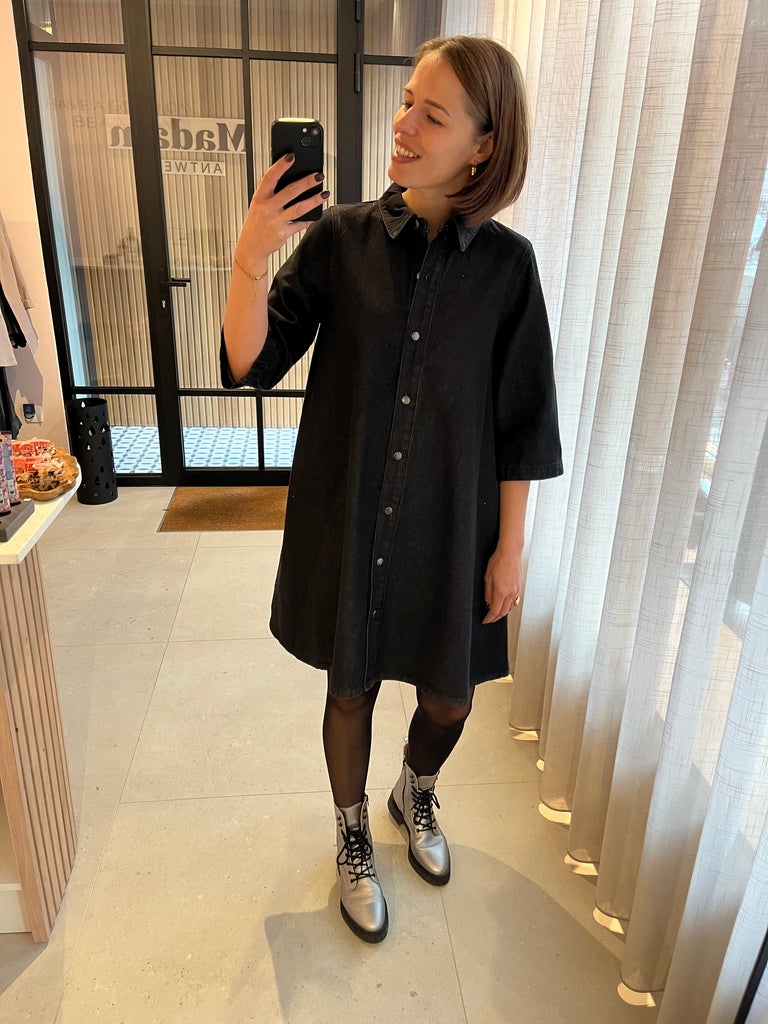 Losvallende A-lijn jeansjurk met halflange mouwen en prachtige steentjes op de stof. Sluiting met knopen vooraan.