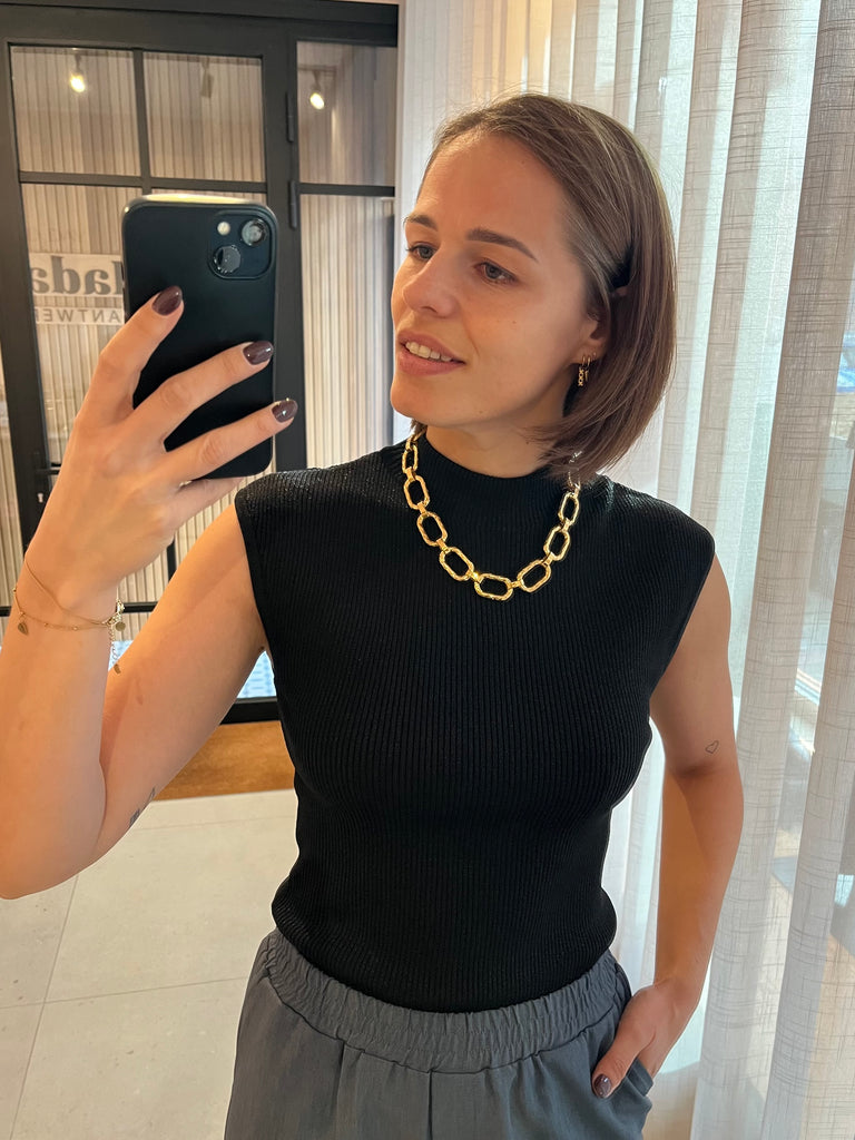 Aansluitende top in elastische ribstof met fijne glitter, kapmouwen en opstaand kraagje.