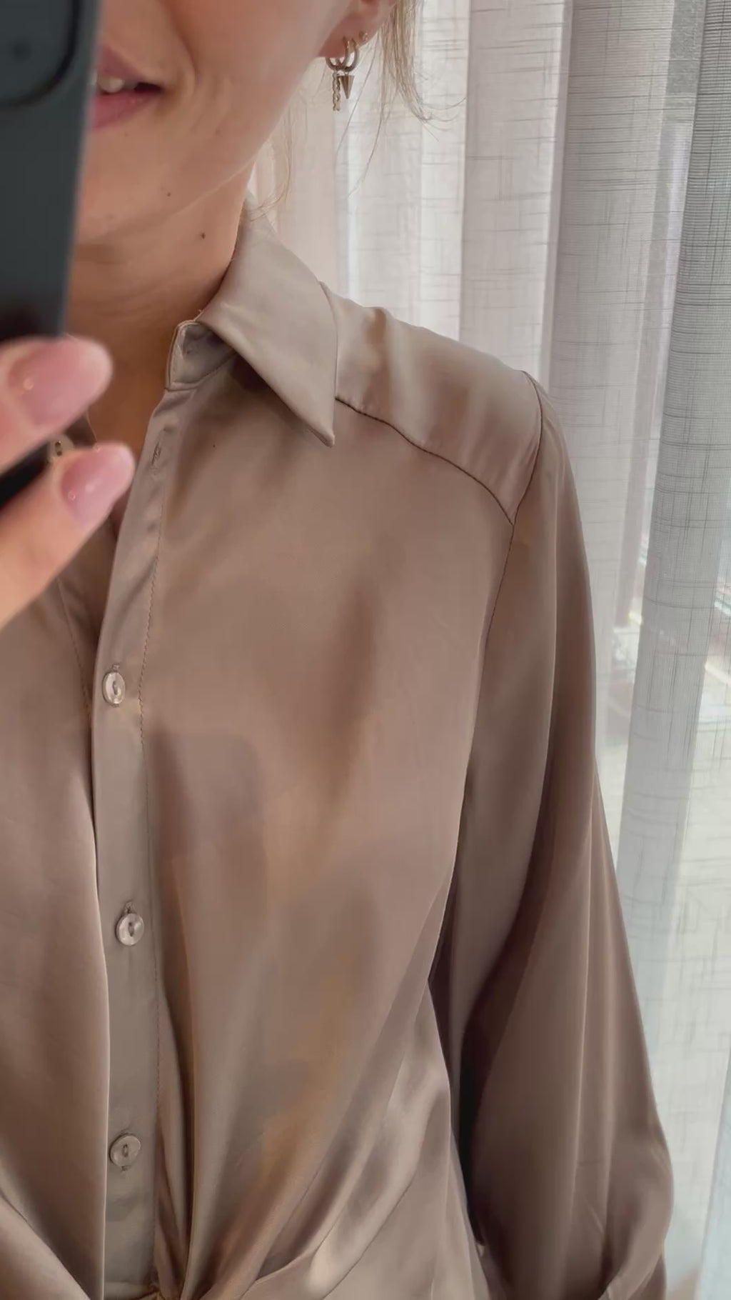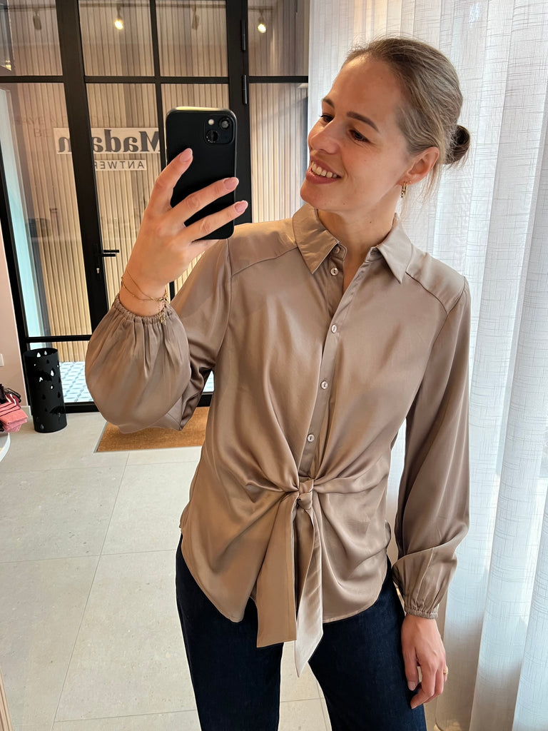 Prachtige blouse met subtiele ballonmouwen en elastisch bandje aan de polsen. Sluiting met knoopjes vooraan en elegant knoopdetail vooraan.