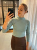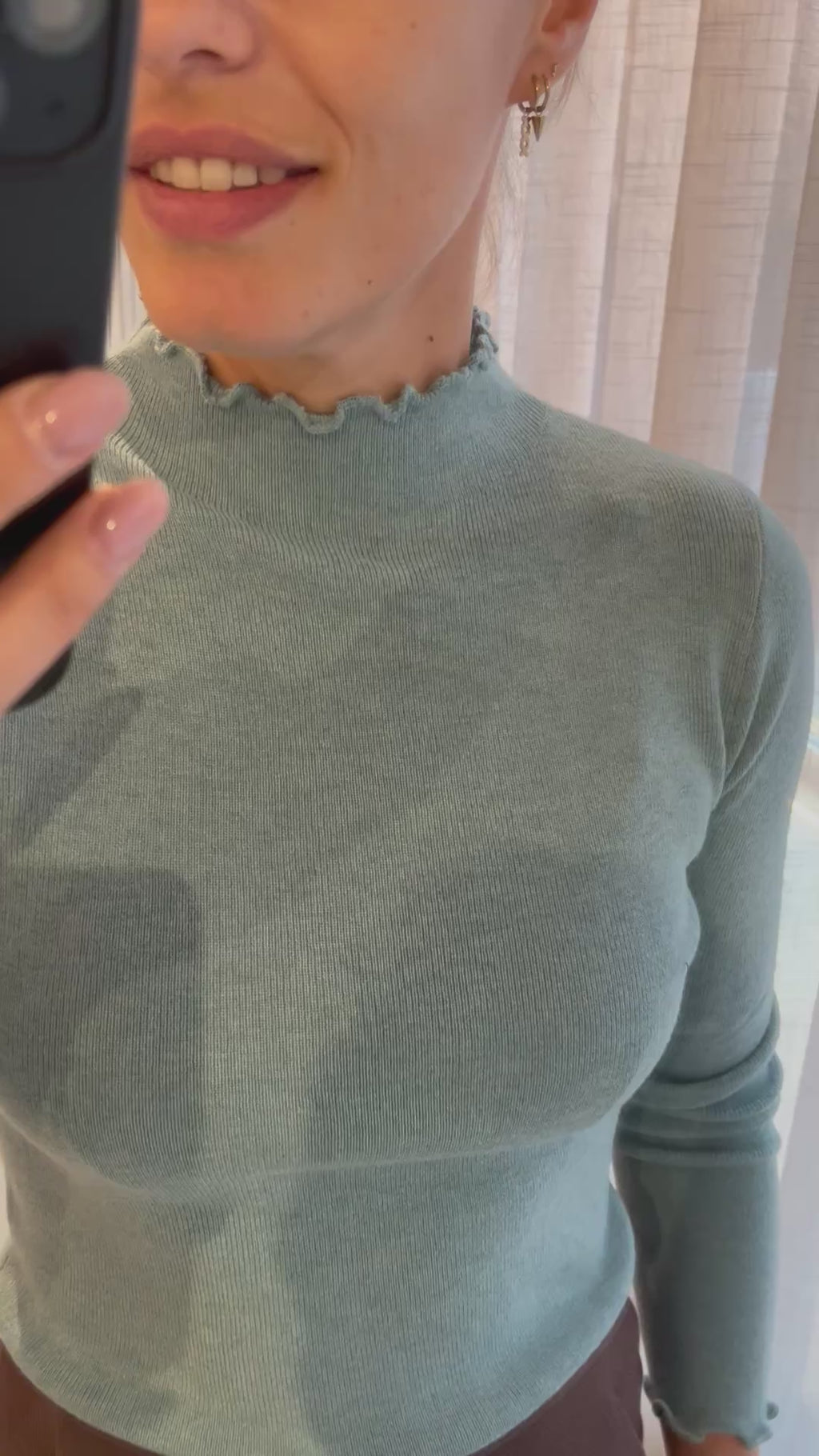 Aansluitende top in zachte ribstof met opstaand kraagje en speels randje aan de uiteinden.