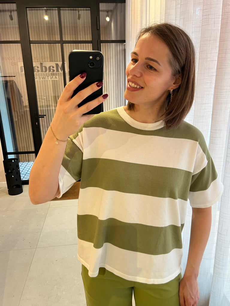 Losvallende top met korte mouwen, afhangende schouders en ronde hals.