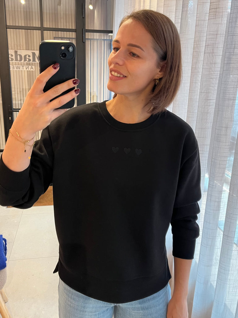 Losvallende sweater met ronde hals en 3 geborduurde hartjes op de borst. Super zachte fleece binnenin!