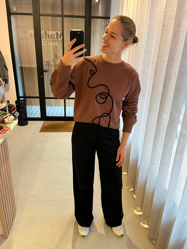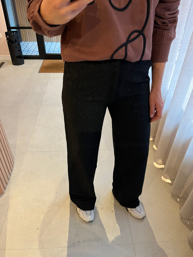 Losvallende broek met hoge taille en subtiele glitter in de stof. Sluiting met rits & knoop. Super leuk als set met top Eva :-)