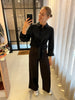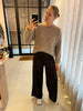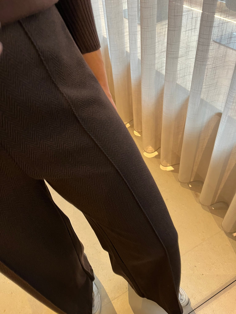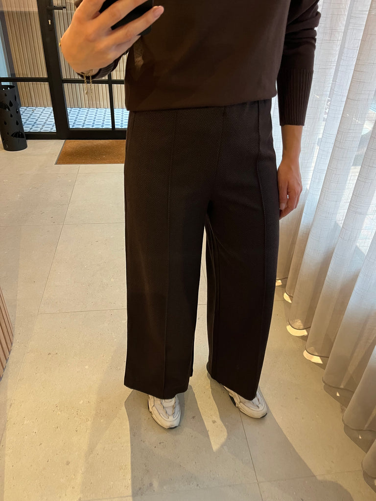 Stijlvolle, comfortabele broek met hoge taille, wijde pijpen en elastische tailleband. Sluiting met rits aan de zijkant en sierzakken achteraan.