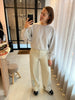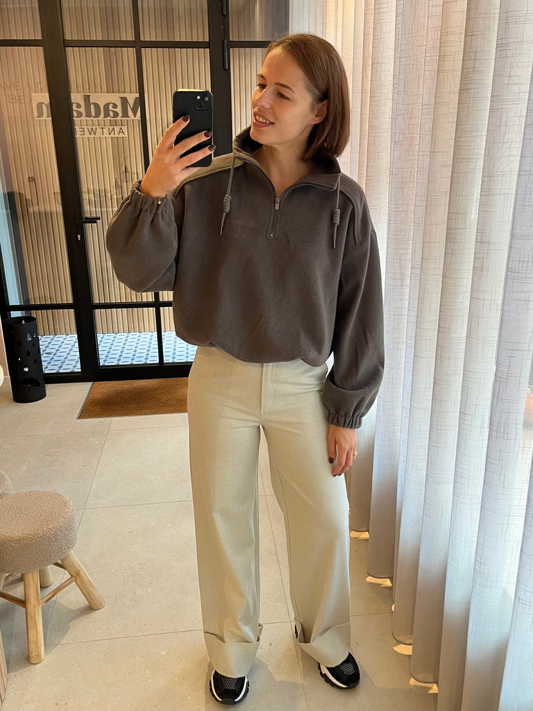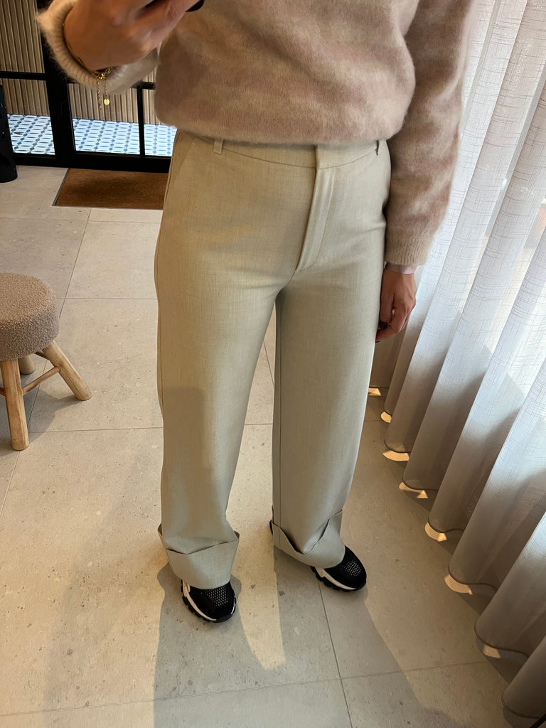 Stijlvolle broek met wijde pijpen, hoge taille, zakjes en brede omgeslagen zoom. Sluiting met knoop en rits vooraan, elastische band achteraan.