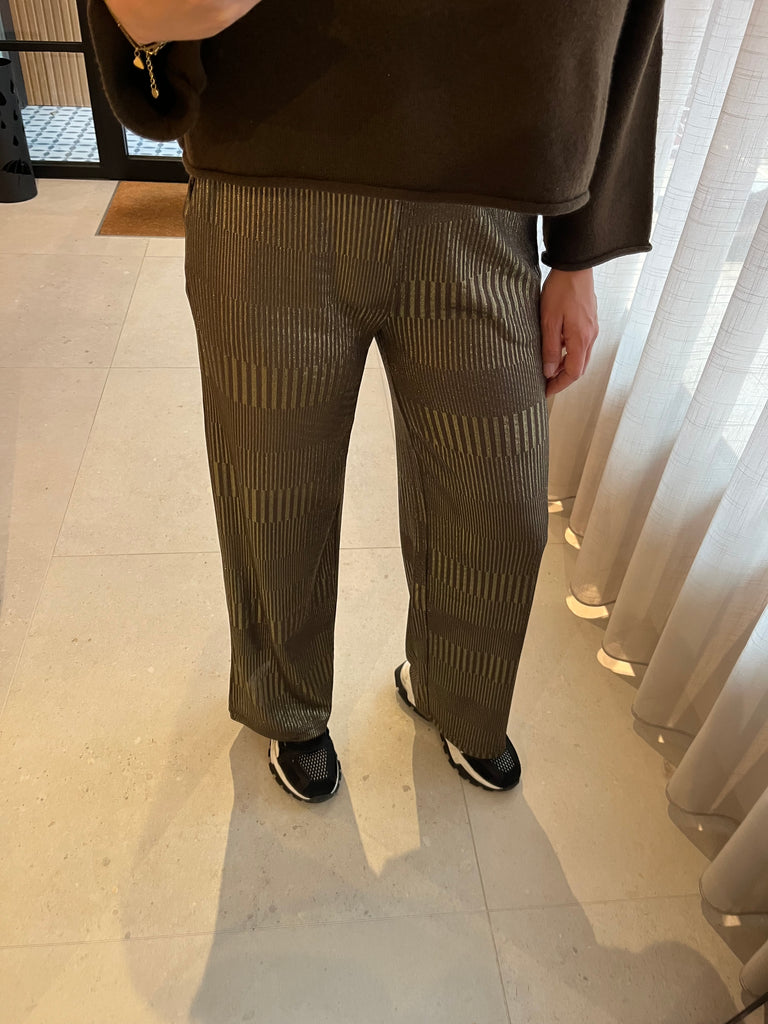 Losvallende broek met wijde pijpen, elastische tailleband en hoge taille. Zalig zachte glitter-stof.