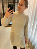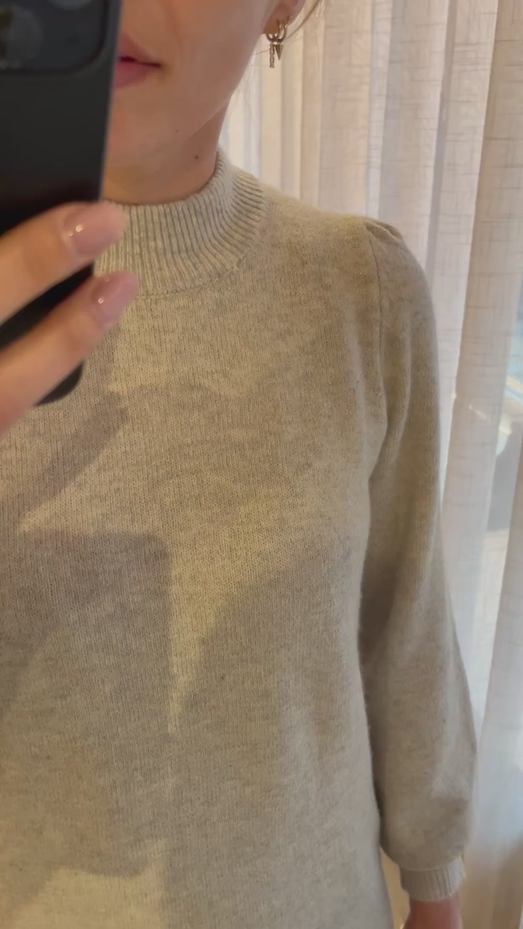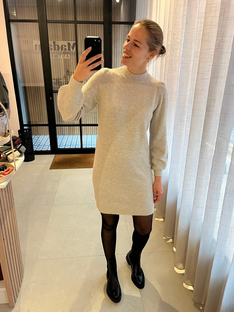 Losvallende, gebreide jurk met ronde hals en lange mouwen.